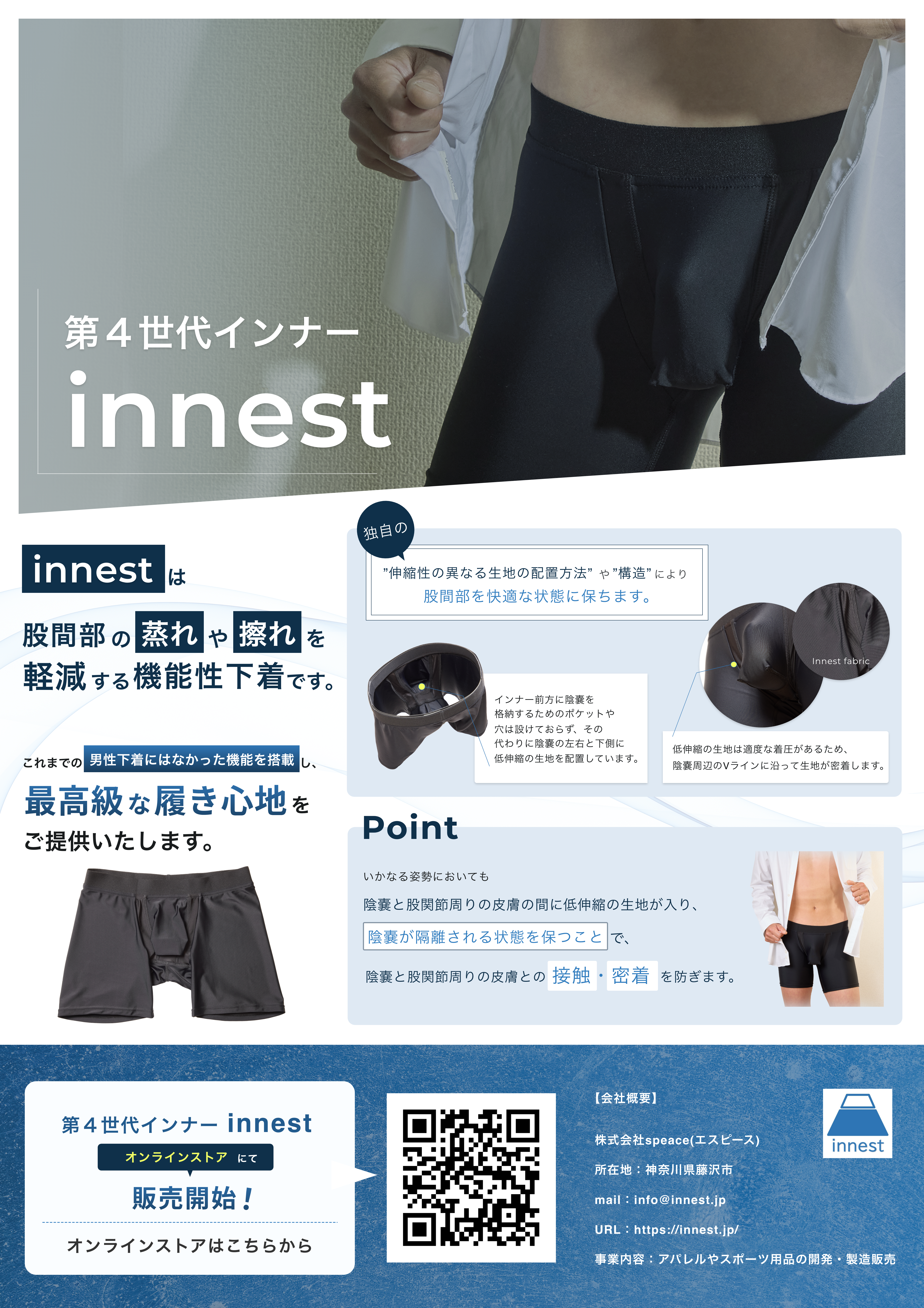 innestは、生地配置と独自構造によって男性の股間部の接触や密着を防ぎ、「蒸れ」や「摩擦」を軽減させこれまでになかった履き心地をご提供しております。